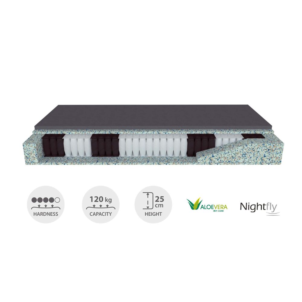 - lisamugavust pakub ühel pool mugav ja kõrgekvaliteetne Nightfly poroloon (paksus 3 cm, pehmem pool). Nightfly on kõrgete tehniliste parameetritega vee baasil Itaalias toodetud poroloon, tagab väga hea õhuringluse ja vastupidavuse niiskusele ning temperatuurile. Võrreldes tavaporoloonidega annab see madratsites palju suurema punktipainduvuse, tänu millele on inimese selgroog optimaalselt toetatud
